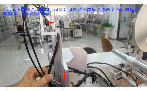 設(shè)備通氣之后調(diào)試兩個(gè)氣缸的傳感器原位,顯示燈亮即可。