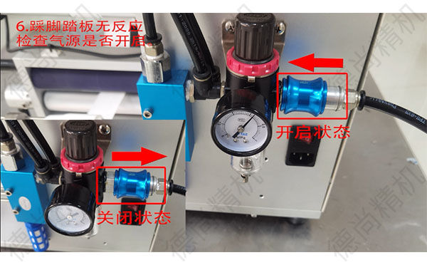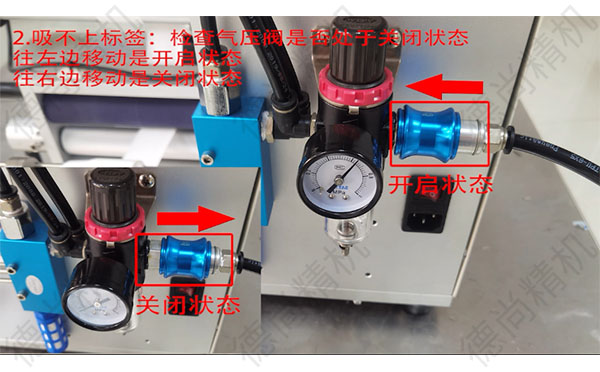 1.檢查氣壓閥是否處于關(guān)閉狀態(tài),往左邊移動(dòng)是開啟狀態(tài),往右邊移動(dòng)是關(guān)閉狀態(tài)。