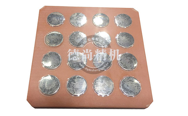 金屬紐扣半自動(dòng)貼膜機(jī),一次可多個(gè)產(chǎn)品同時(shí)貼附?